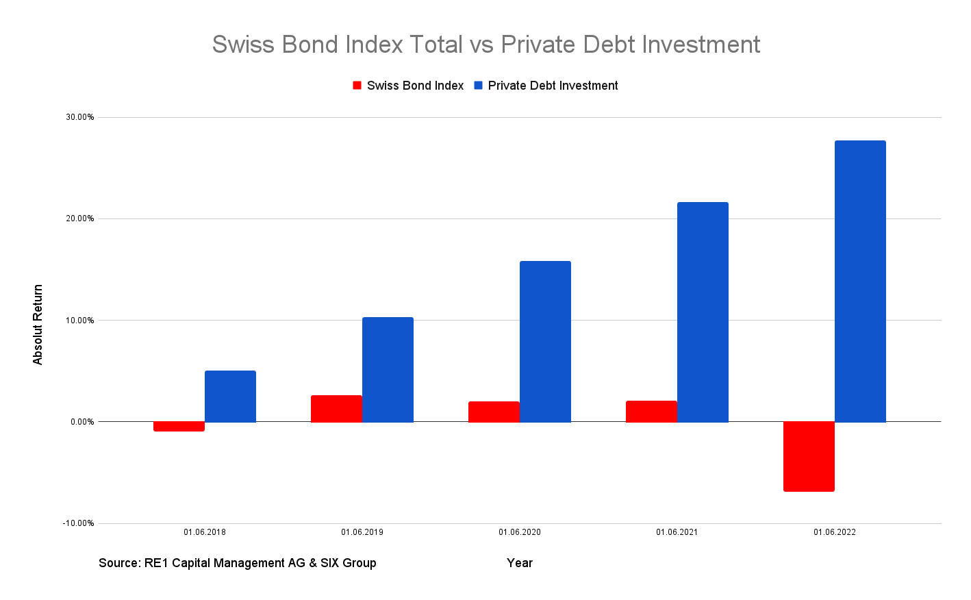 Real Estate Private Debt Anlagen überzeugen durch einen Fixzins von 5 – 8% + SARON (mind. 0.000%). Sie können sich vom Marktwert der Liegenschaft überzeugen und damit die Sicherheit vollständig nachvollziehen. Die Schuldbriefsumme beläuft sich auf maximal 80% des Marktwertes, wobei wir stets drittgeprüfte Bewertungen von Wüest Partner, Fahrländer Partner oder IAZI verwenden. Die Grundstücke unserer Entwickler befinden sich in besten Lagen in der Schweiz. Dies führt im Vergleich mit gängigen Anleihen zu Überrenditen. Siehe nachfolgende Vergleichsgrafik zwischen dem Swiss Bond Index vs. einem unserer Bestandsimmobilien Private Debt Investments.